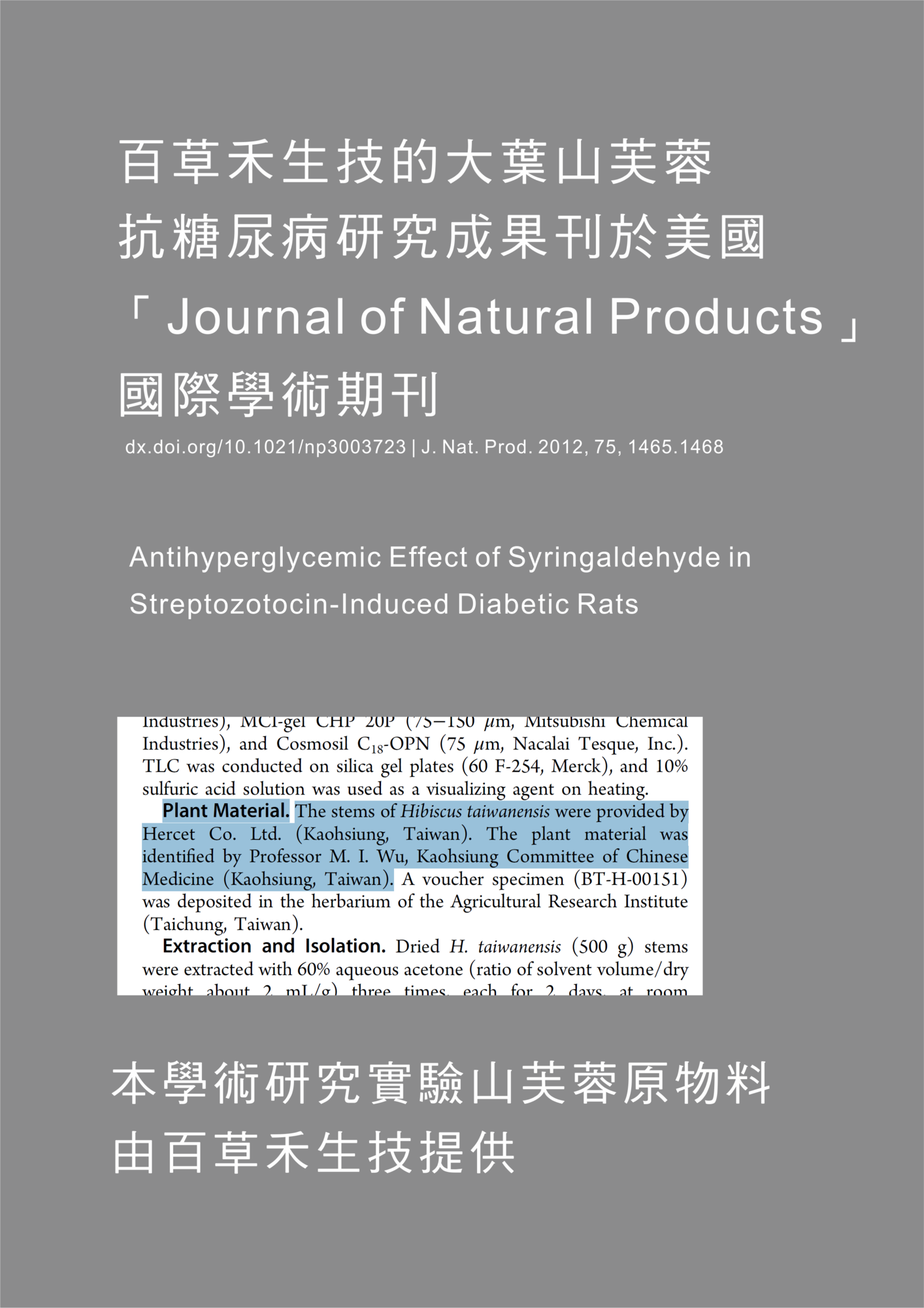 百草禾生技的大葉山芙蓉抗糖尿病研究成果榮獲美國「天然物Journal of Natural Products」國際學術期刊的認證及刊登Antihyperglycemic Effect of Syringaldehyde in Streptozotocin-Induced Diabetic Rats