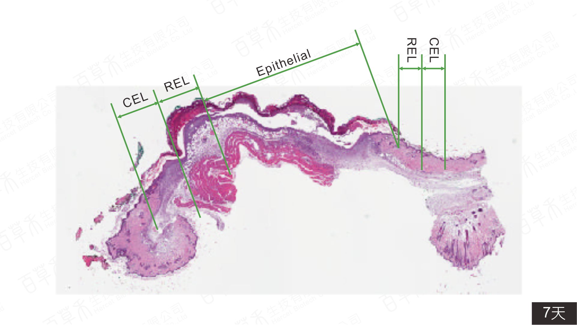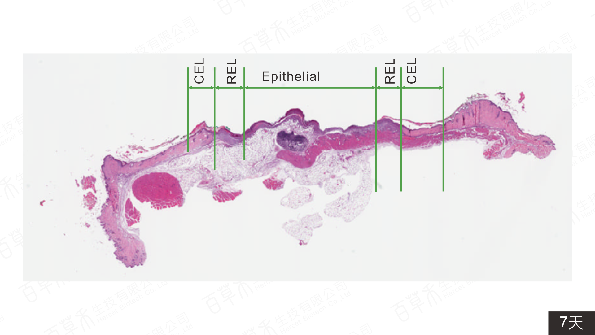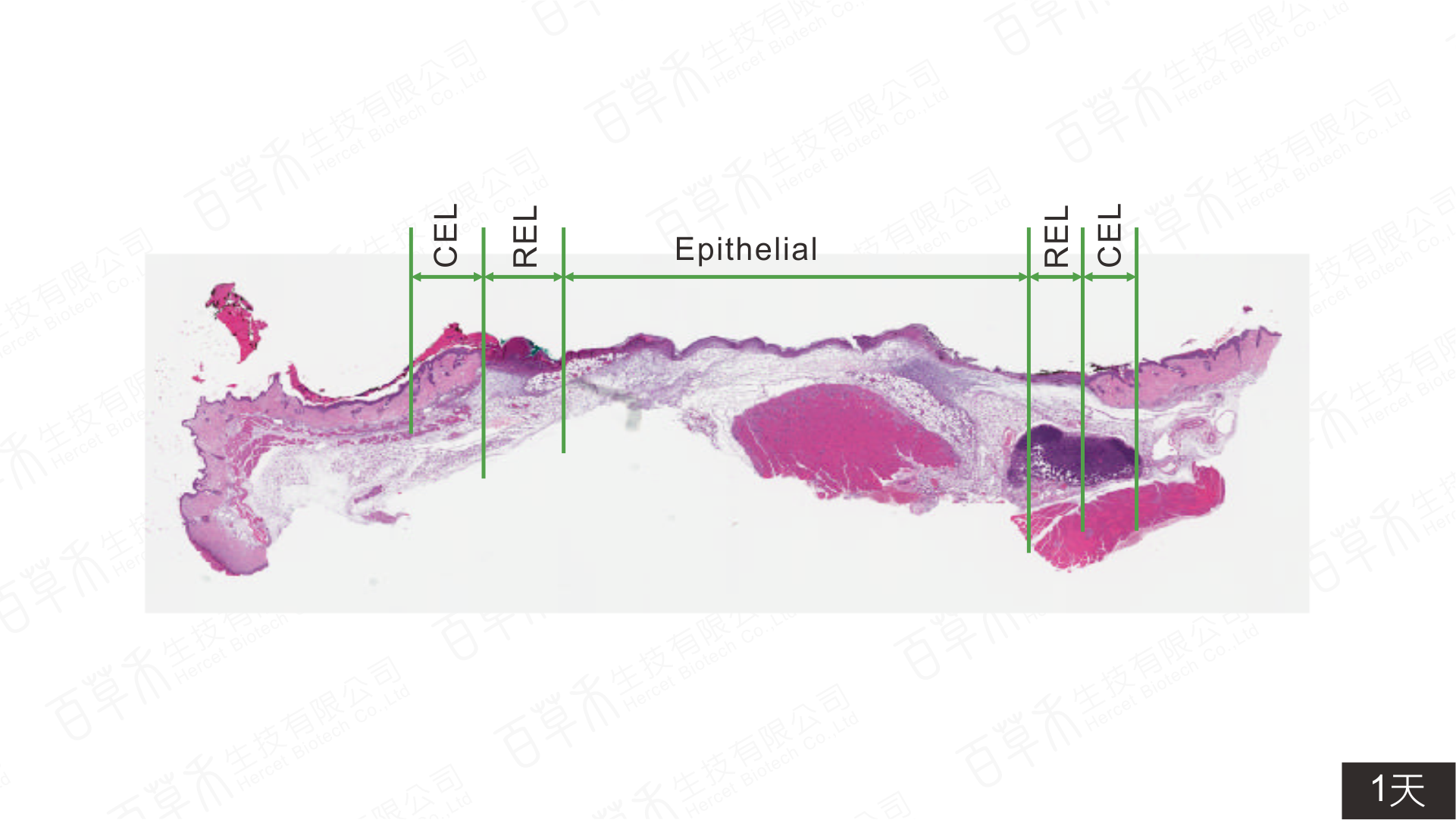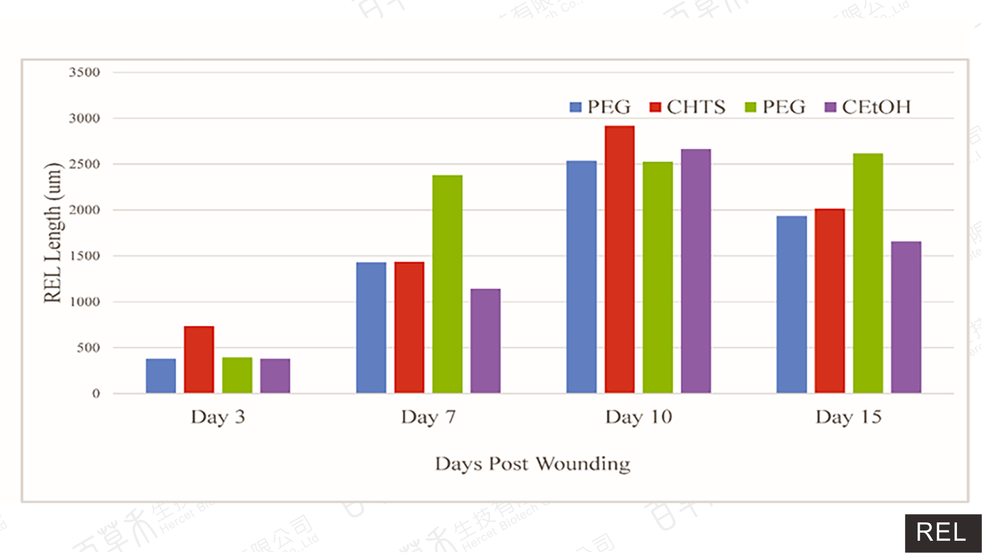 百草禾生技的 HERCET® -s 複方萃取物,在Epithelial上皮組織、TEL(Total epithelialization length)、CEL(contracted/remodeled epithelium (CE) length)收縮/重塑上皮、REL(regenerative/proliferative epithelium (RE) length)再生/增殖上皮,這四項肌膚癒合實驗項目中遠優於單一山芙蓉萃取物。癒合的速度效果與天數的縮短十分明顯