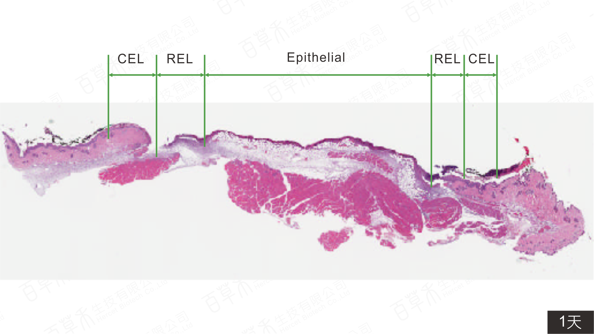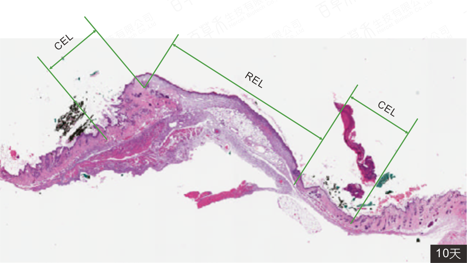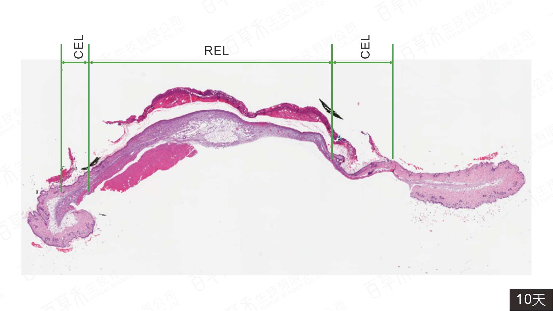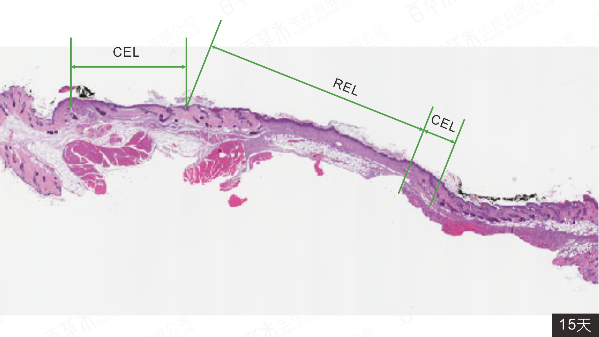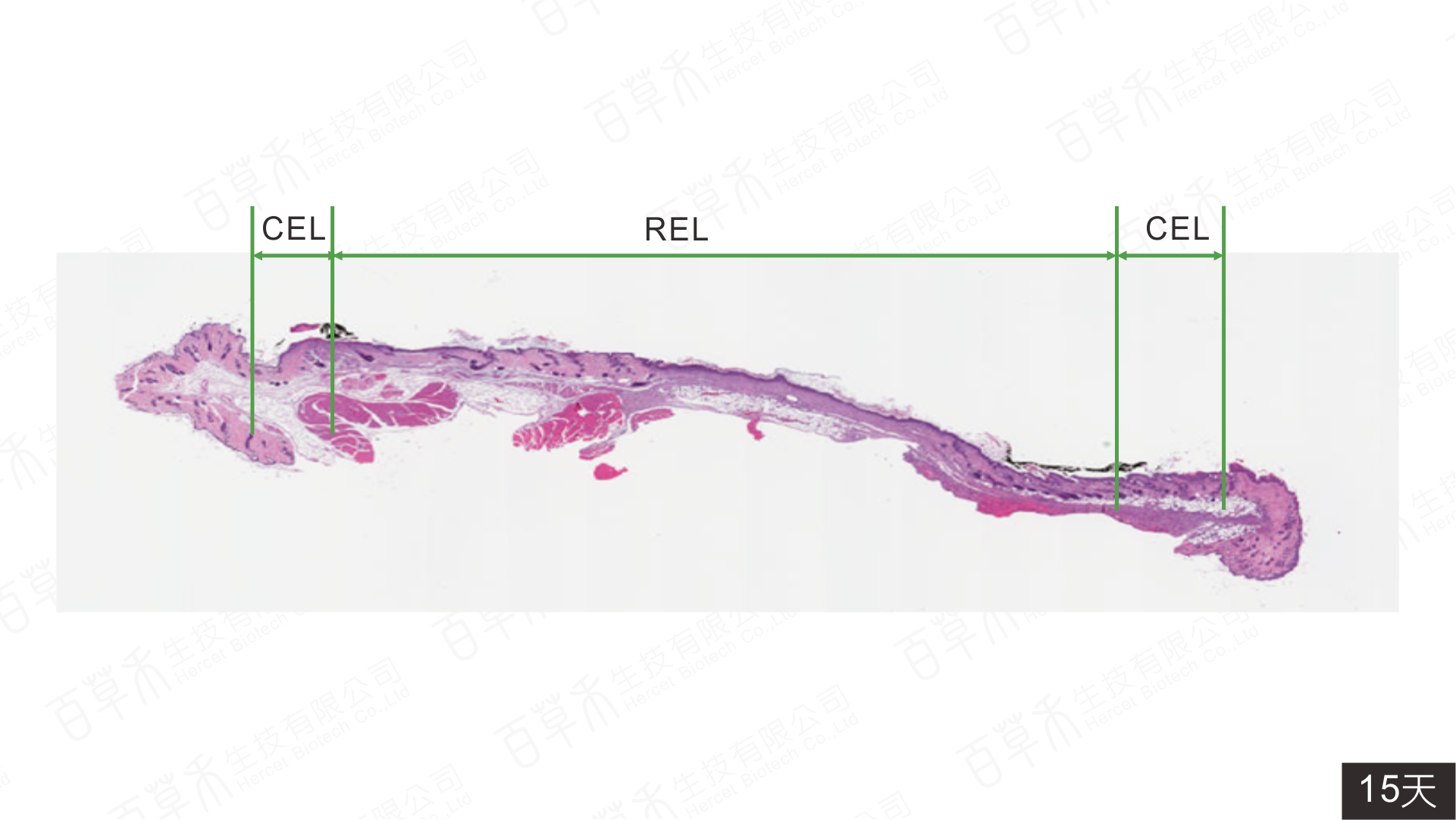 REL:regenerative/proliferative epithelium (RE) length,再生/增殖上皮,此數值代表傷口癒合中細胞再生的情形,此(數值越高越好)代表再生的情形越好,但在傷口修復後期會略為下降及持平